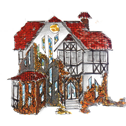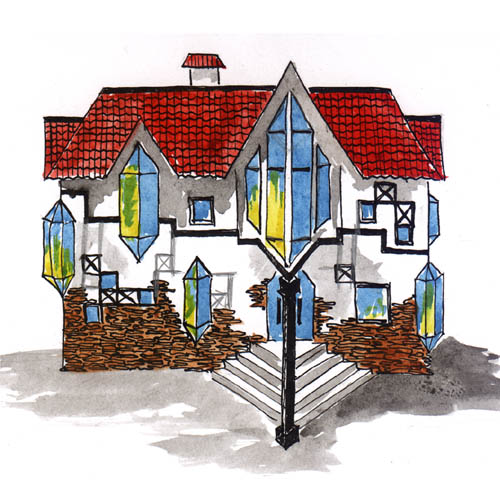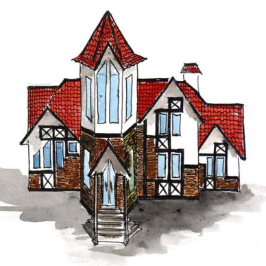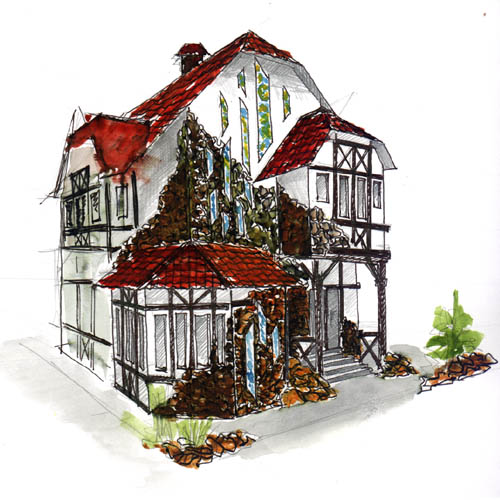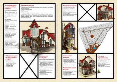 Участие в разработке концепции котеджного поселка (жилые дома и административные здания). Рисунок (тушь, акварель). Дизайн, верстка.