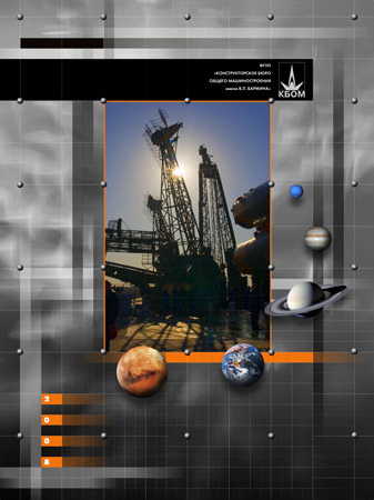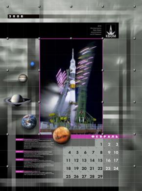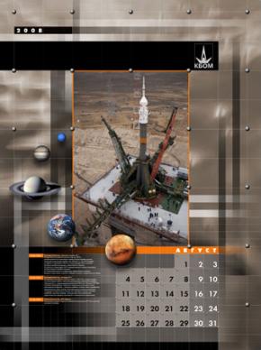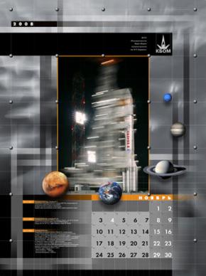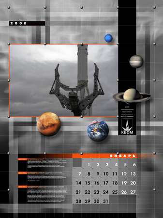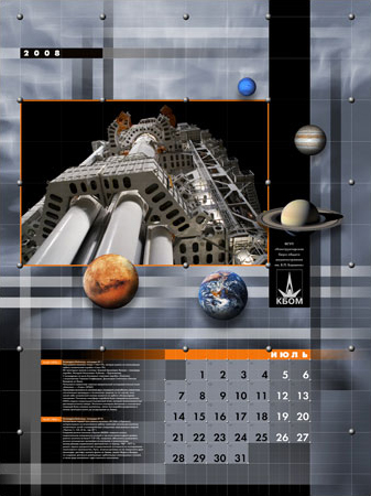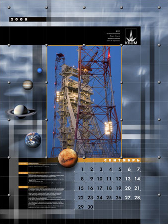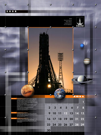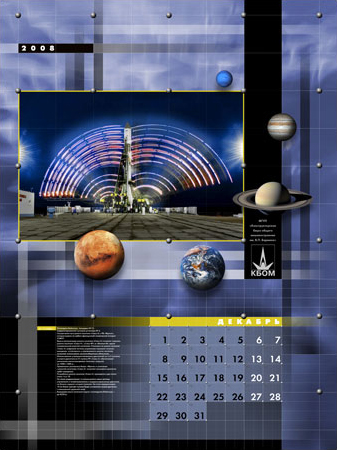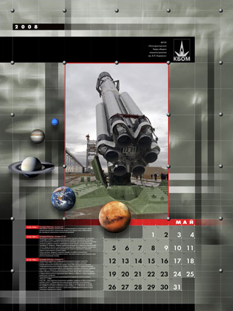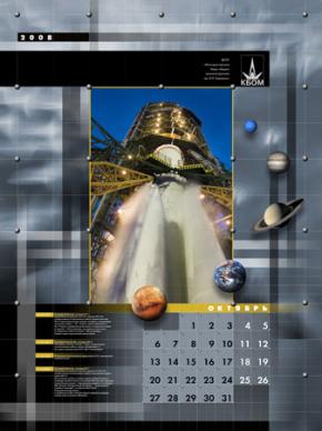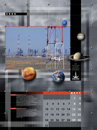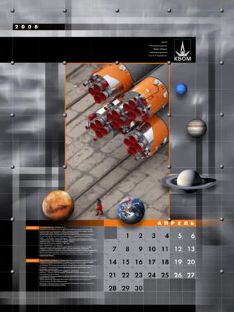 Настенный перекидной календарь формата А2 выполнен в высокотехнологичном дизайне, подчеркивающем яркие фотографии стартовых ракетных комплексов, строителем которых является КБОМ. В этом календаре продолжена идея информационно-исторического наполнения каждого месяца в текстовой части. В данной работе все, включая идею, фотосъемку стартовых комплексов на космодроме Байконур, дизайн, его воплощение, подбор информационной части, было реализовано нашей командой.