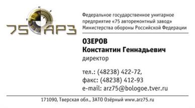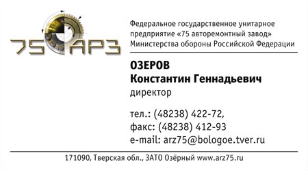 Логотип 75-го авторемонтного завода (75-й АРЗ), занимающегося отнюдь не столько ремонтом автомобилей, сколько сложнейшими работами по производству, ремонту и восстановлению заправочной техники космических средств, оборудования и приборов для неразрушающего контроля и многими другими высокотехнологичными работами. Визитная карточка сотрудников завода отныне выглядит именно так.