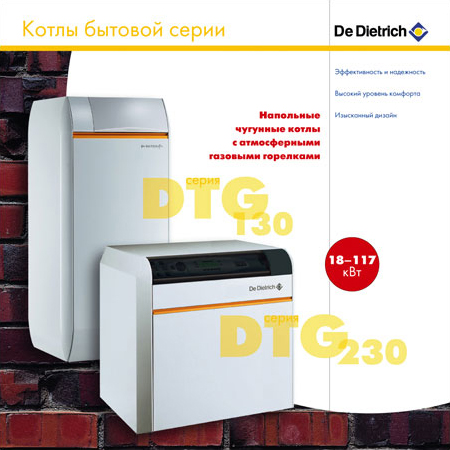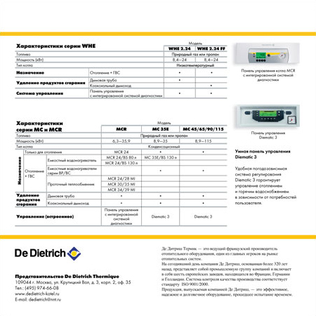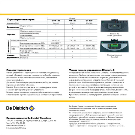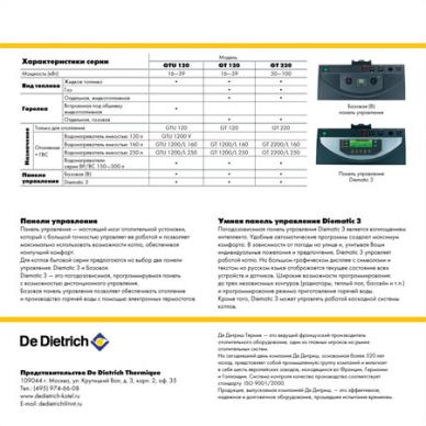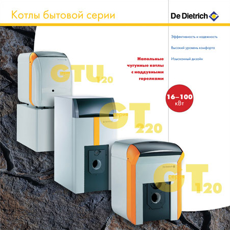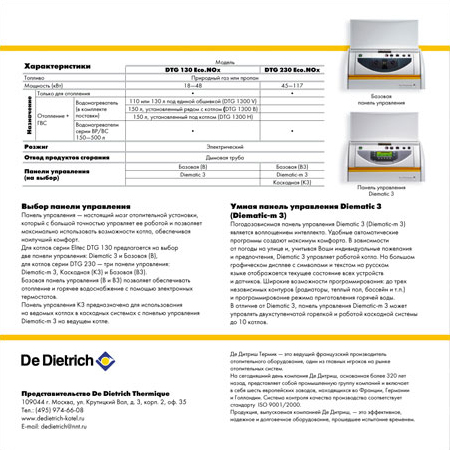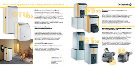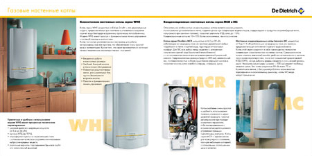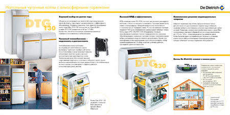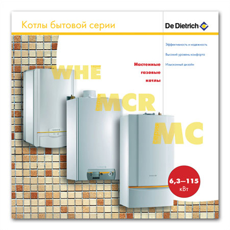 Буклеты по различным сериям продукции DeDietrich выполнены в "российском" стиле презентационной и рекламной полиграфии компании. Формат 210х210 мм, использованный в брошюре о компании, позволил на 4 полосах каждого буклета разместить максисмум информационного материала и иллюстраций продукции.