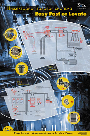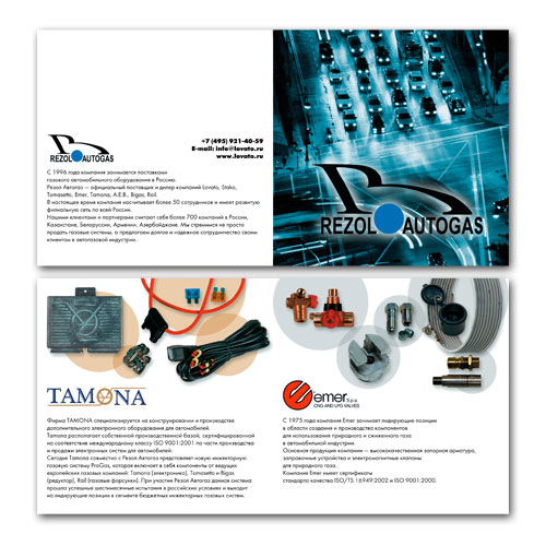 Для одного из крупнейших поставщиков газобалонного оборудования на российском рынке, компании Резол Автогаз, к выставке была разработана серия плакатов. Информационный плакат формата А1 со схемами подключения оборудования был отпечатан офсетным способом для раздачи его всем клиентам и партнерам компании. Квадратные рекламные плакаты формата 60 х 60 см служили для оформления стенда. В выставочный комплект входил и диск с информациоными материалами, вкладыш в который показан здесь же.