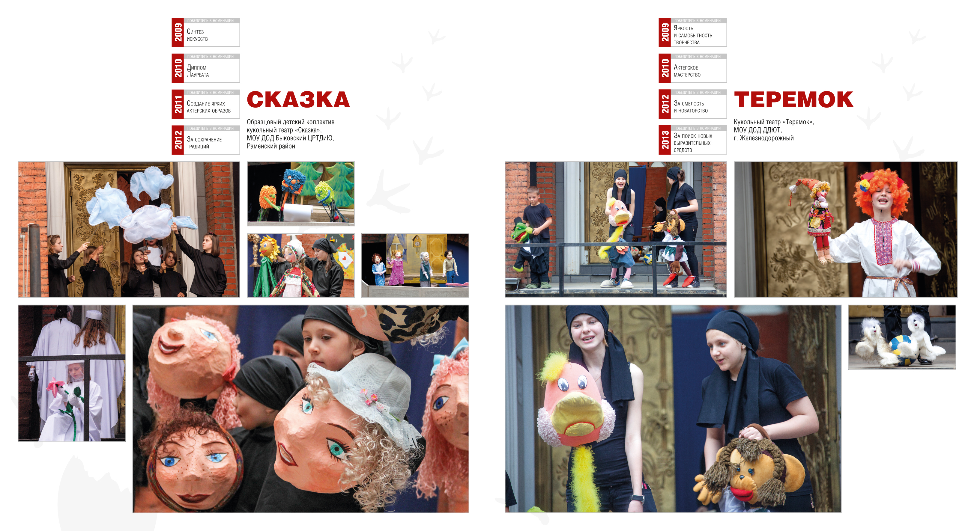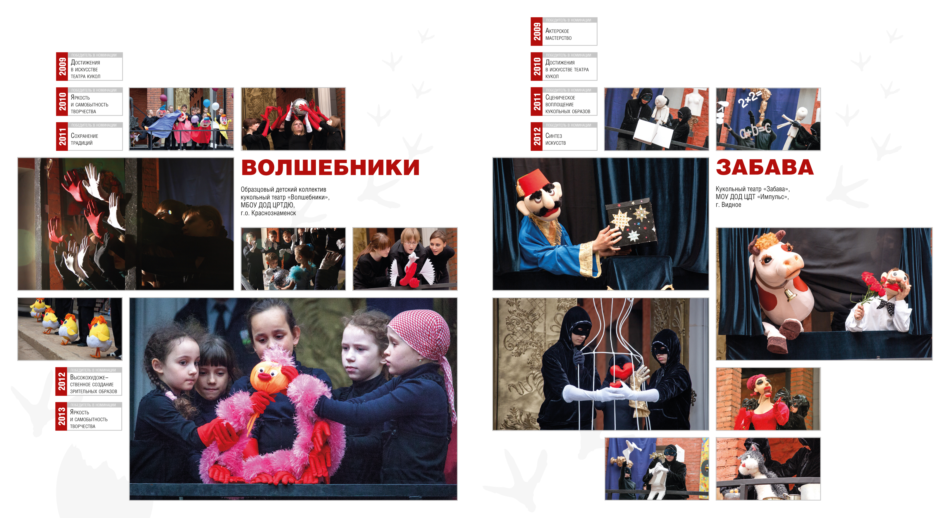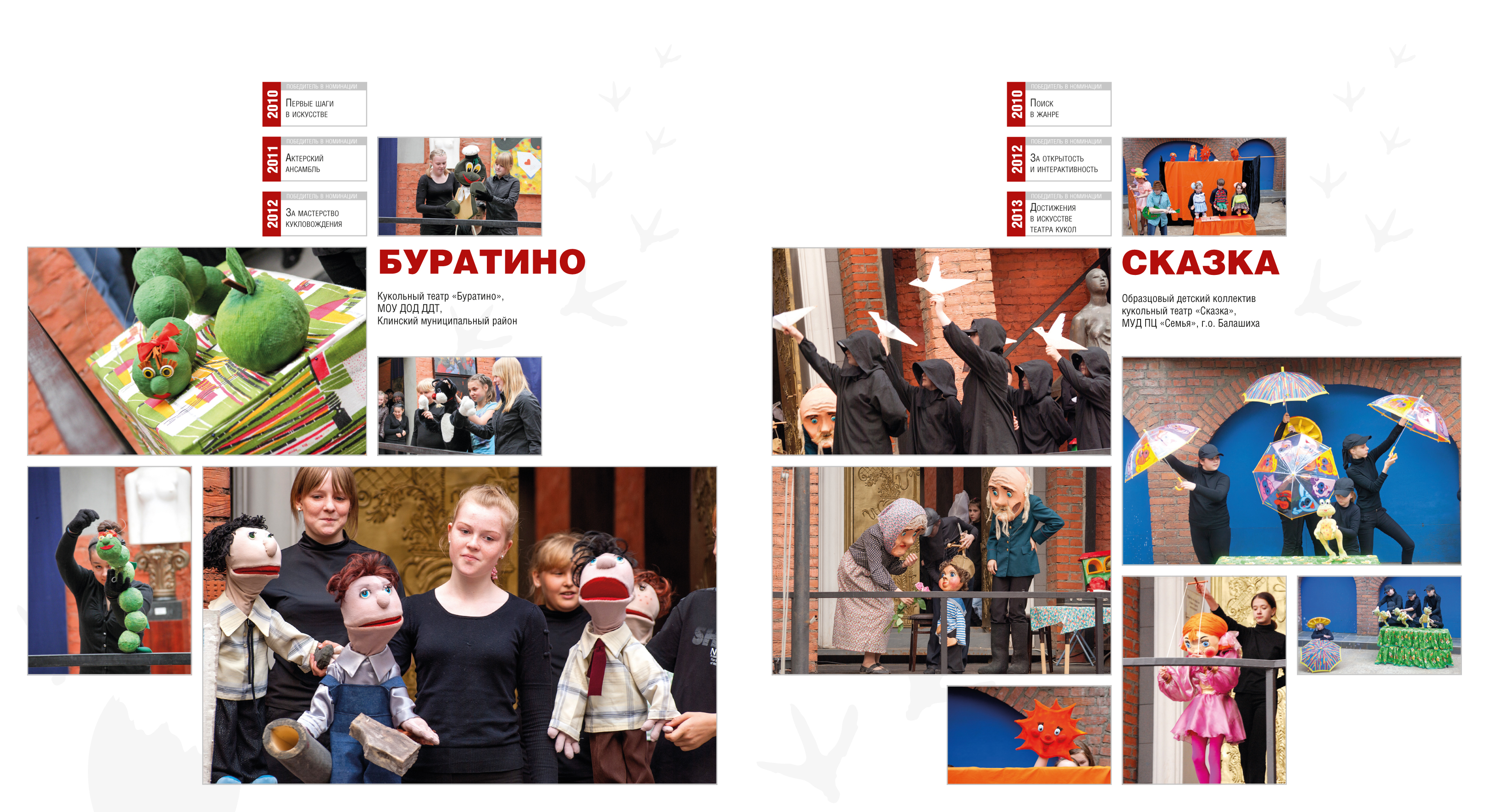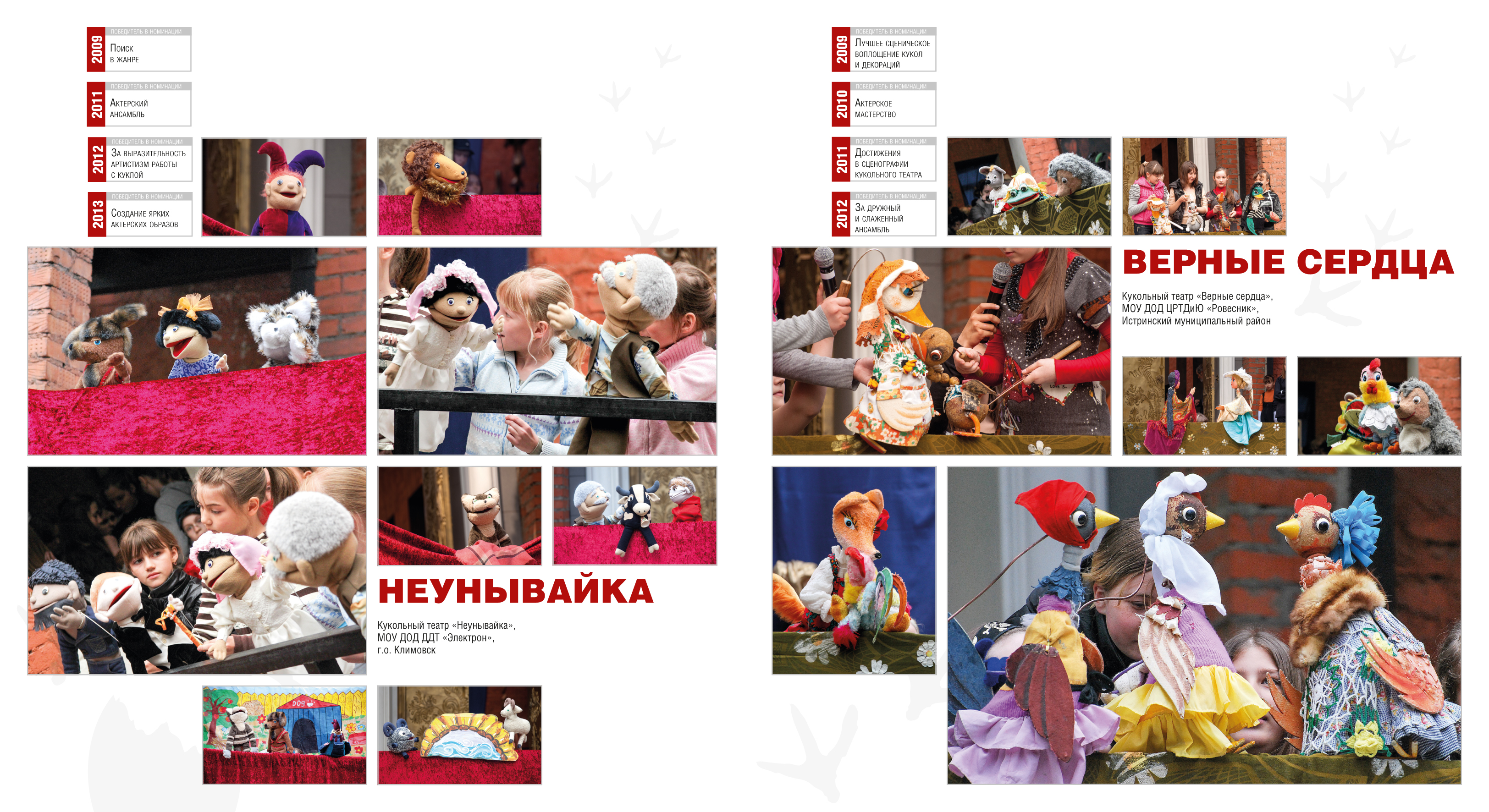 Отчетная брошюра по результатам проведения фестиваля, организованном Фондом развития детских кукольных театров. Проведение фотосъемок, дизайн, верстка.