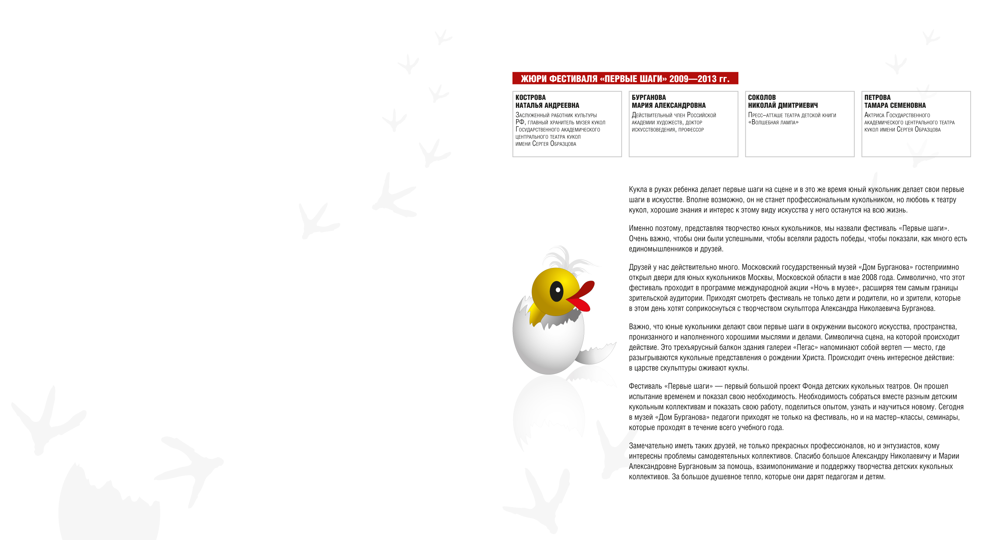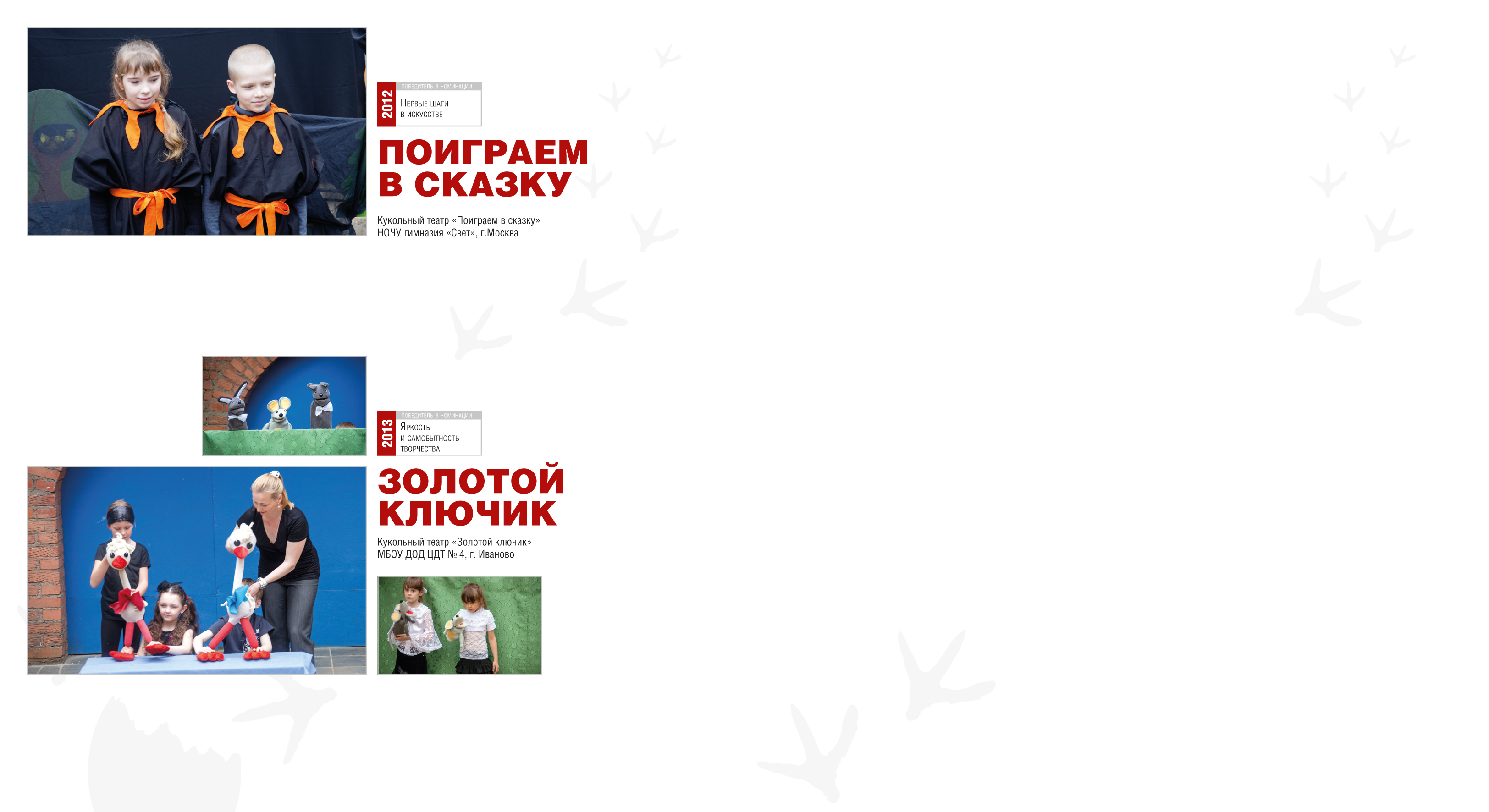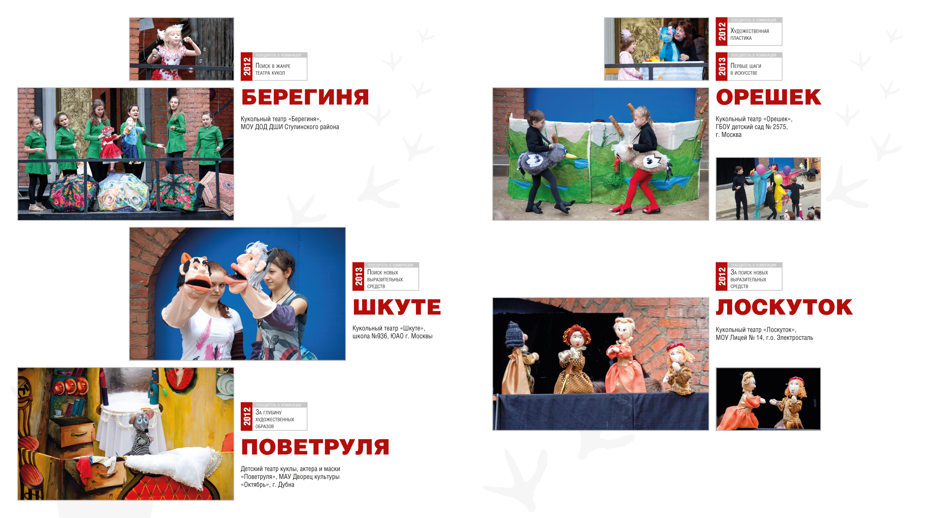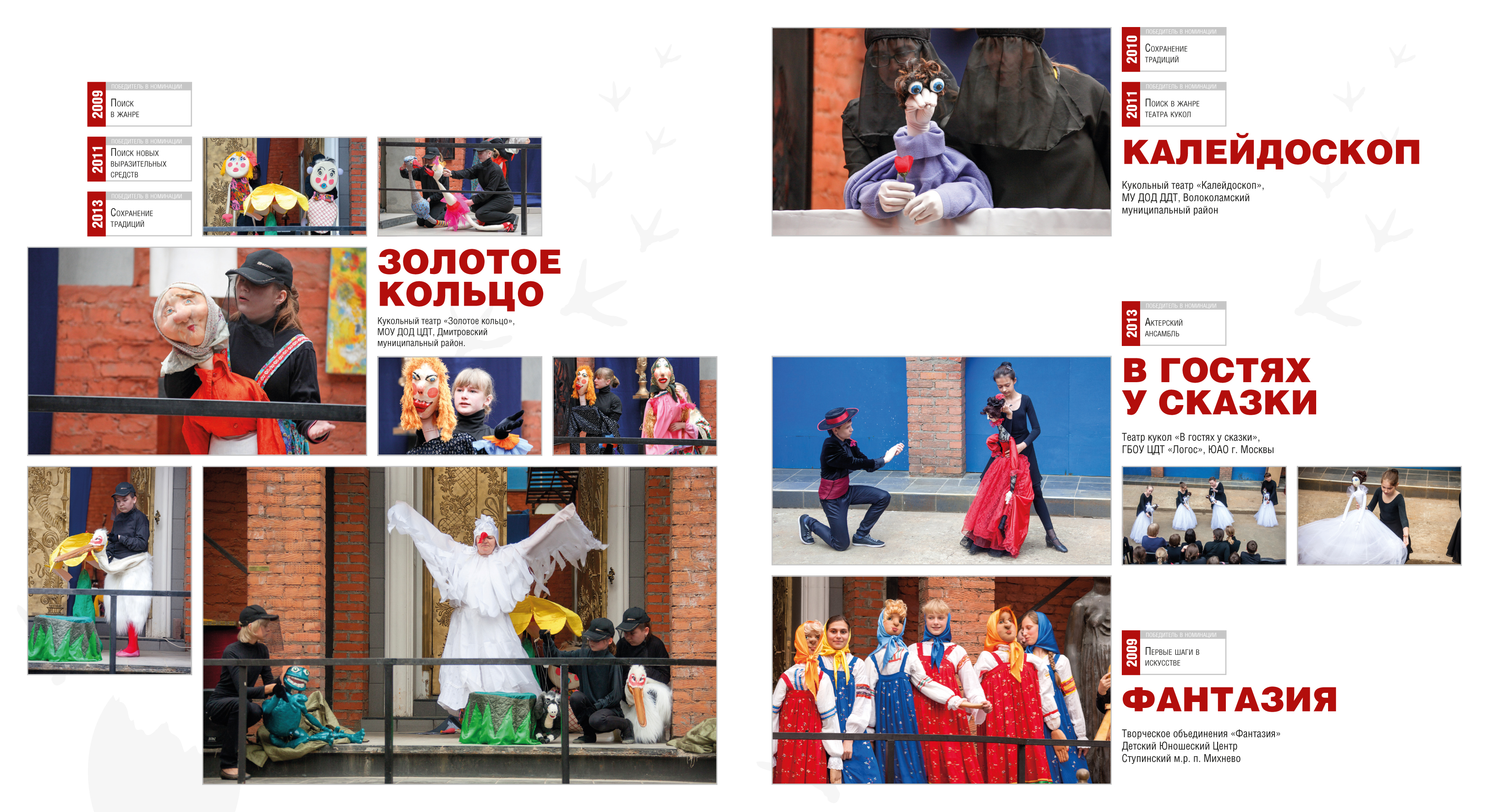 Отчетная брошюра по результатам проведения фестиваля, организованном Фондом развития детских кукольных театров. Проведение фотосъемок, дизайн, верстка.