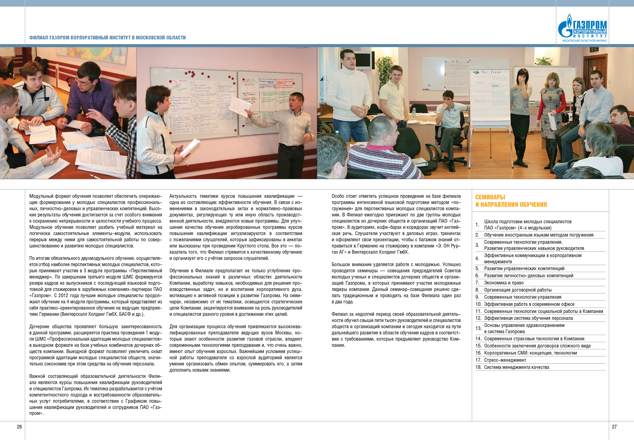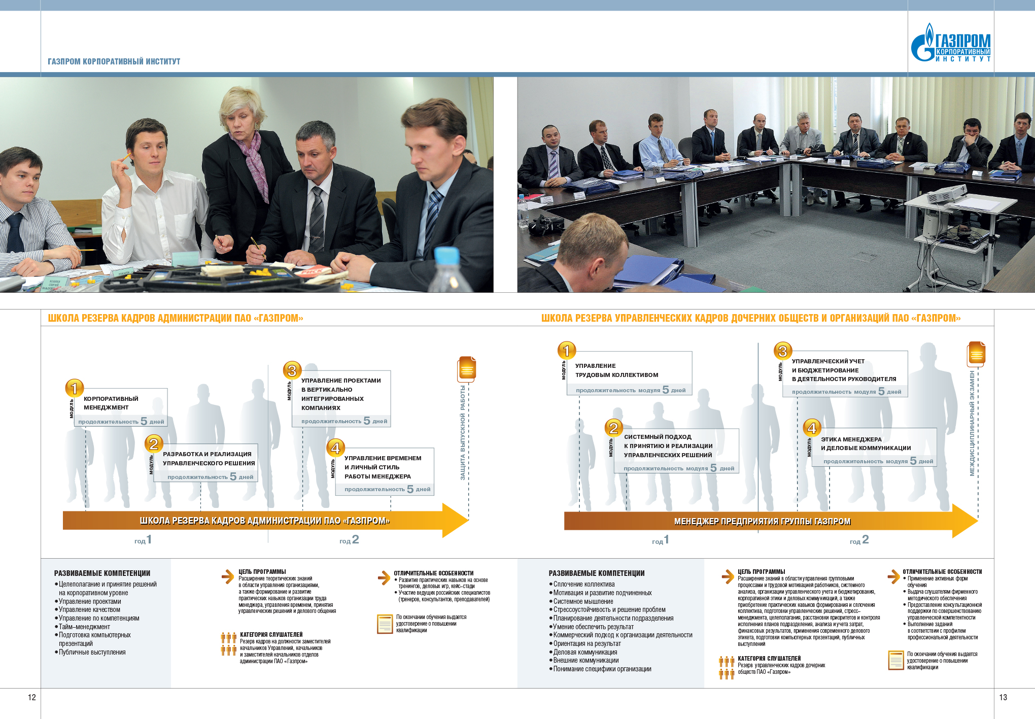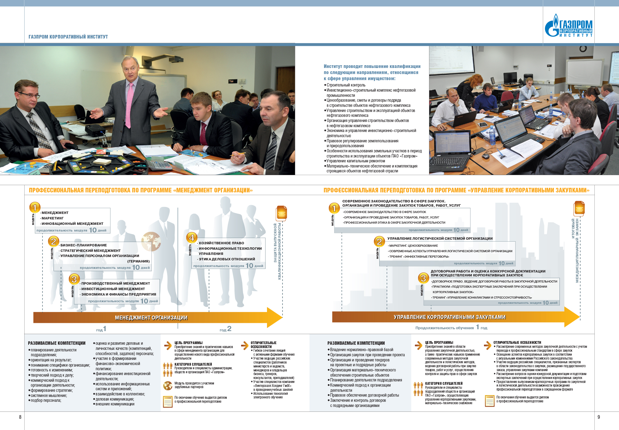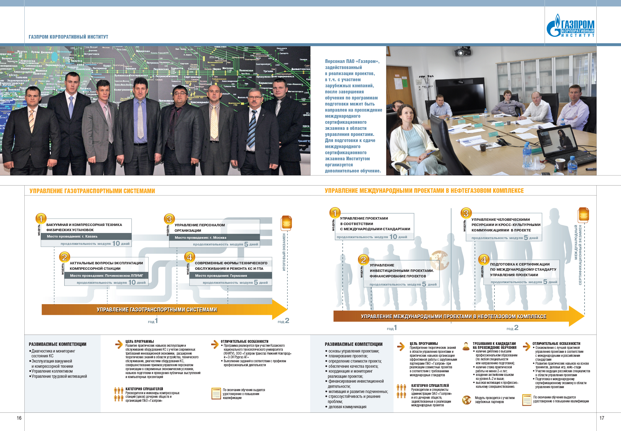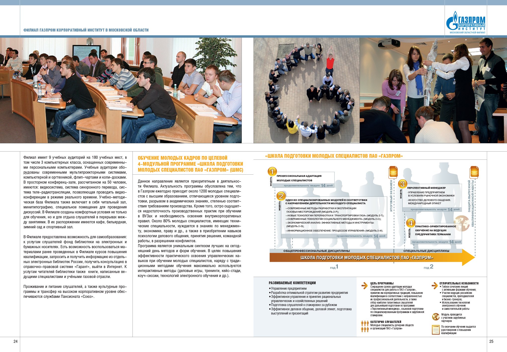 Брошюра Корпоративного института Газпром с описанием филиалов института и программ проф. подготовки. Инфографика, дизайн и верстка брошюры.